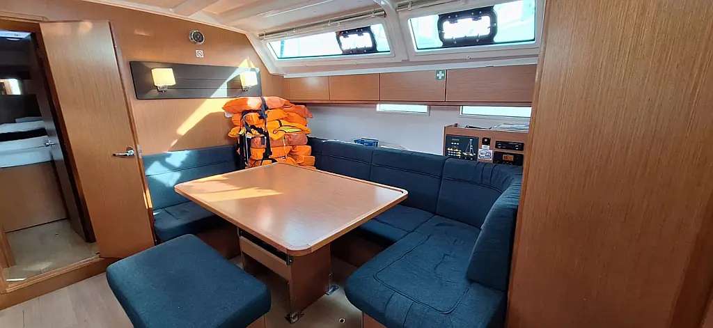 Bimini top, Bathing platform, Gangway, Sprayhood, Cockpit table, Cockpit/stern, outside shower, Swimming ladder, Dinghy + pump, Outboard motor, Cockpit cushions, Main anchor, Mooring ropes, Plastic bucket, Spare anchor (reserve, auxiliary anchor), Impeller, V-belt, oilfilter, Electric anchor windlass, Anchor swivel, Black ball and cone, Boat hook, Fenders, Spring line, Water hose, Winch handles
