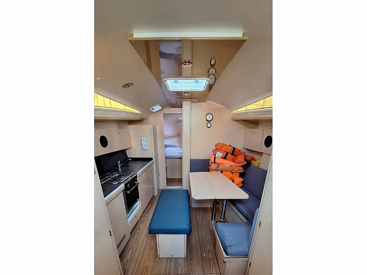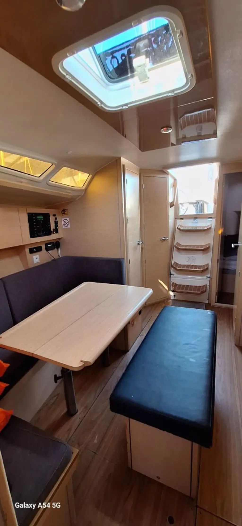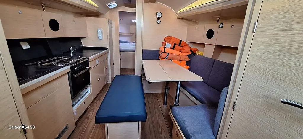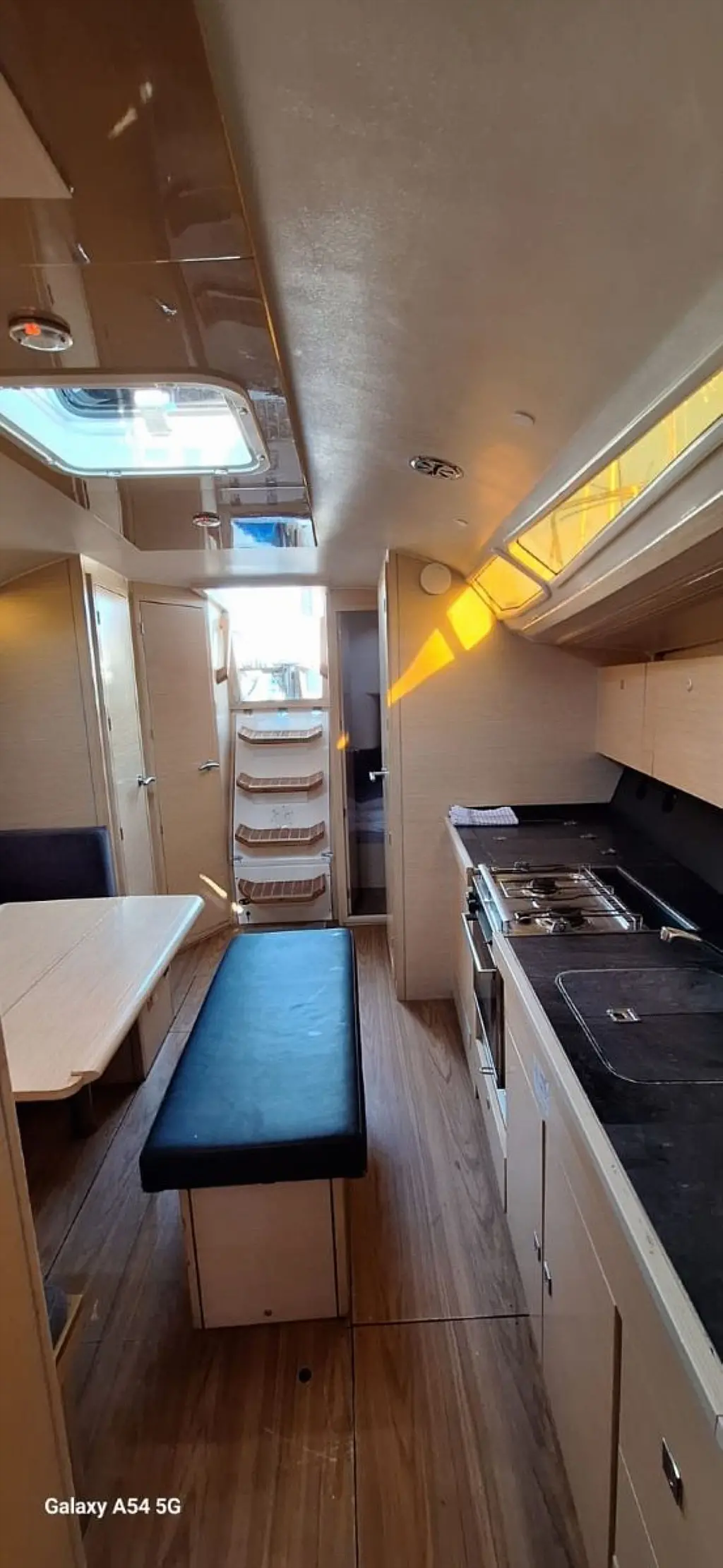 Gangway, Sprayhood, Teak cockpit, Cockpit table, Cockpit/stern, outside shower, Swimming ladder, Dinghy + pump, Outboard motor, Cockpit cushions, Main anchor, Mooring ropes, Plastic bucket, Spare anchor (reserve, auxiliary anchor), Impeller, V-belt, oilfilter, Electric anchor windlass, Anchor swivel, Black ball and cone, Boat hook, Fenders, Spring line, Water hose, Winch handles