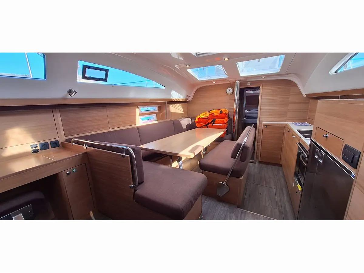 Bimini top, Bathing platform, Gangway, Sprayhood, Teak cockpit, Cockpit table, Cockpit/stern, outside shower, Swimming ladder, Dinghy + pump, Outboard motor, Cockpit cushions, Main anchor, Mooring ropes, Plastic bucket, Spare anchor (reserve, auxiliary anchor), Impeller, V-belt, oilfilter, Electric anchor windlass, Anchor swivel, Black ball and cone, Boat hook, Fenders, Spring line, Water hose, Winch handles