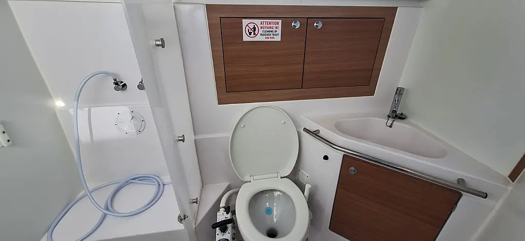 Bilge pump handle, Cabin cushions/pillows, Bed linen per person, Duvet + cover, Toilet, Shower