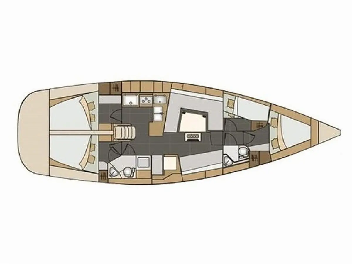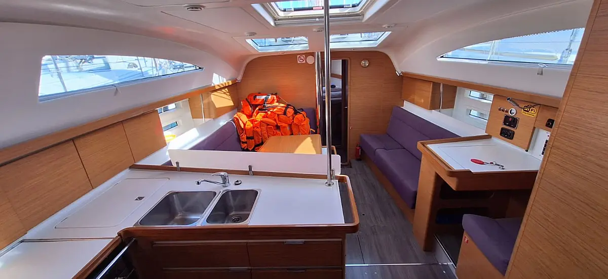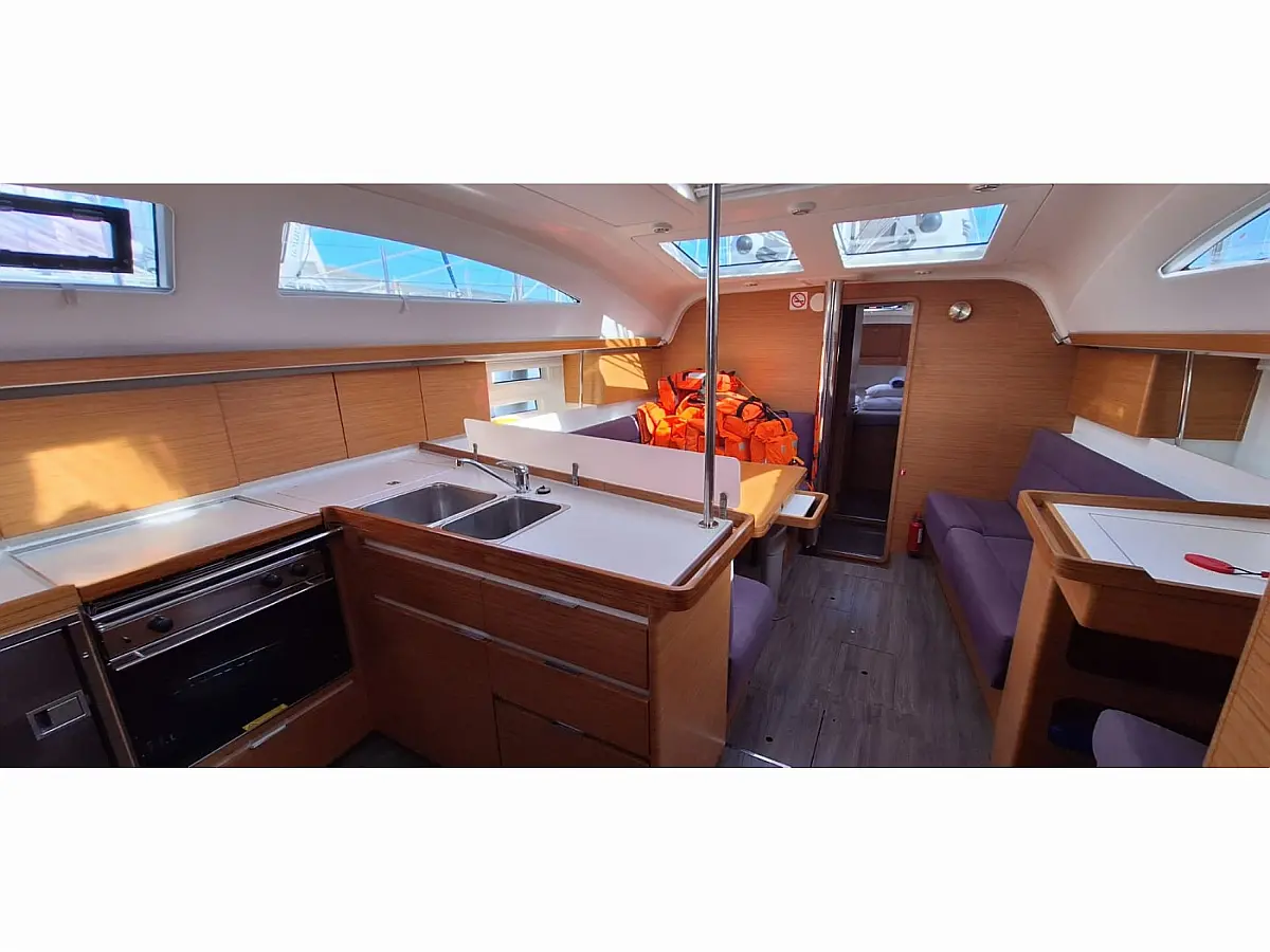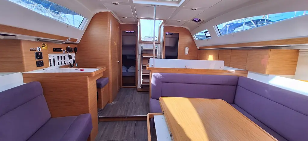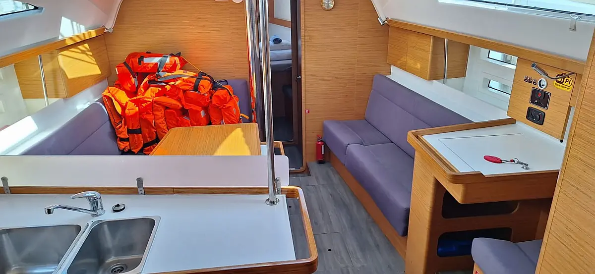 Bimini top, Bathing platform, Gangway, Sprayhood, Teak cockpit, Cockpit table, Cockpit/stern, outside shower, Swimming ladder, Dinghy + pump, Outboard motor, Cockpit cushions, Main anchor, Mooring ropes, Plastic bucket, Spare anchor (reserve, auxiliary anchor), Impeller, V-belt, oilfilter, Electric anchor windlass, Anchor swivel, Black ball and cone, Boat hook, Fenders, Spring line, Water hose, Winch handles