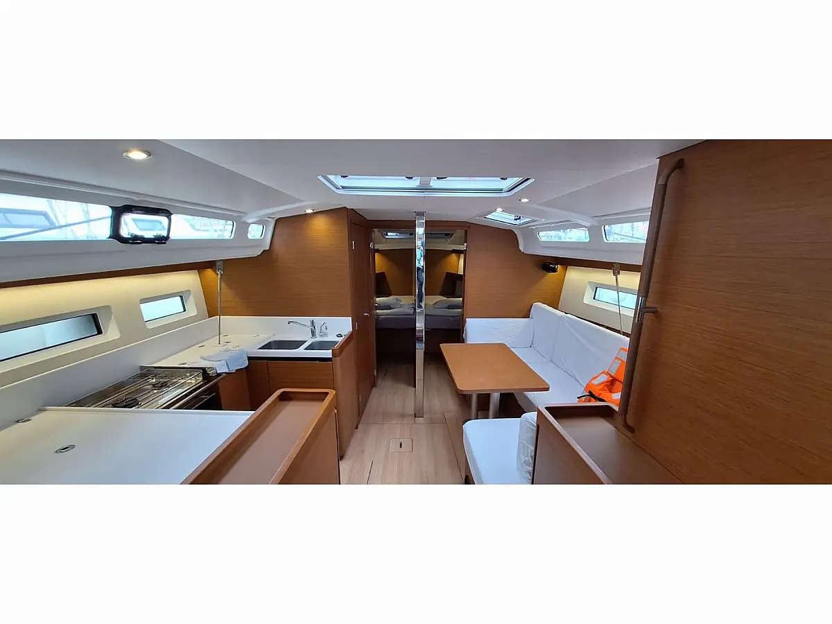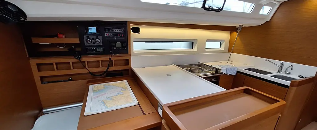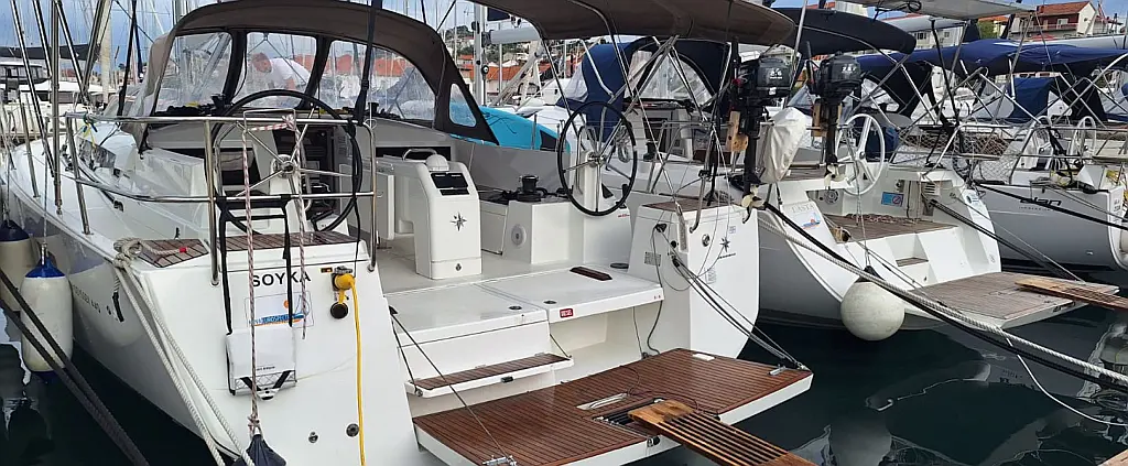 Bimini top, Bathing platform, Gangway, Sprayhood, Cockpit table, Cockpit/stern, outside shower, Swimming ladder, Dinghy + pump, Outboard motor, Cockpit cushions, Main anchor, Mooring ropes, Plastic bucket, Spare anchor (reserve, auxiliary anchor), Impeller, V-belt, oilfilter, Electric anchor windlass, Anchor swivel, Black ball and cone, Boat hook, Fenders, Spring line, Water hose, Winch handles